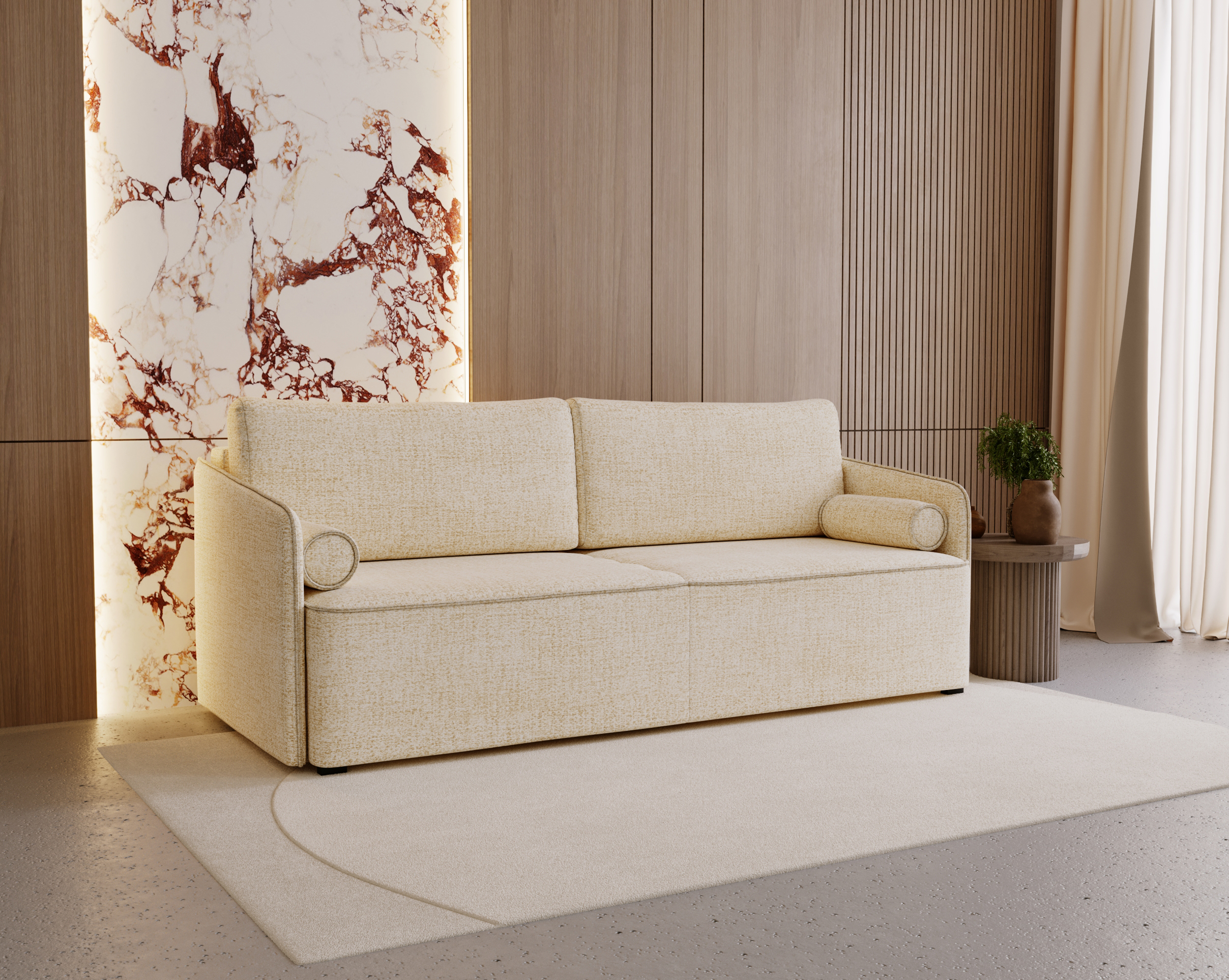 LAMBI – o materiał obiciowy typu boucle, charakteryzujący się miękką, przyjemną w dotyku powierzchnią i charakterystyczną, trójwymiarową strukturą. Jest idealnym wyborem do tapicerowania mebli, jak również do dekoracyjnych akcesoriów, tworząc przytulną atmosferę w pomieszczeniach.