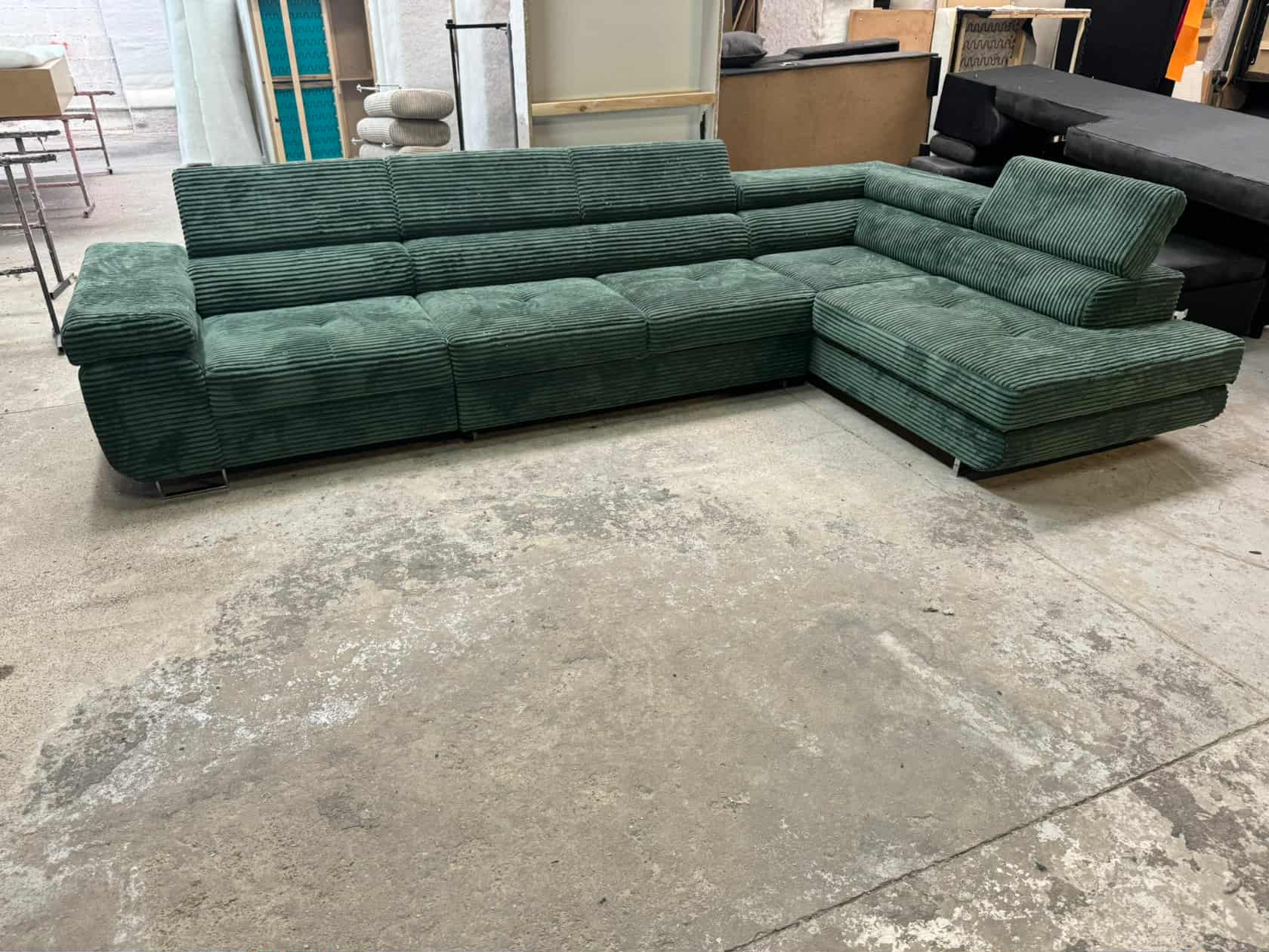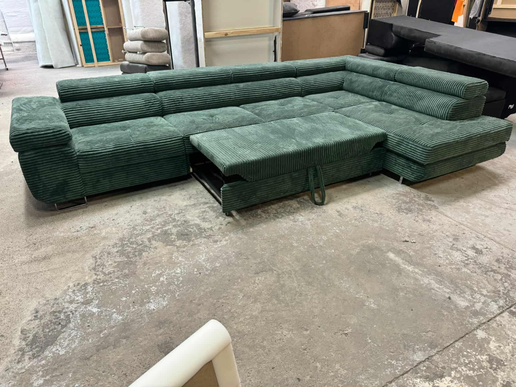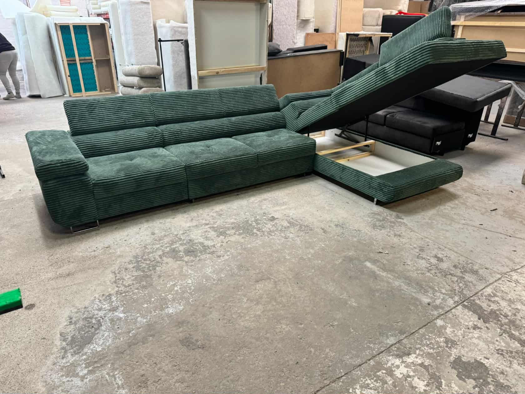 Narożnik Neapol L MAXI – !!! Promocja !!! – TKANINA: TOP SZTRUKS 39 ( Butelkowa Zieleń ) – Funkcja spania ,pojemnik na pościel ,regulowane zagłówki