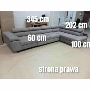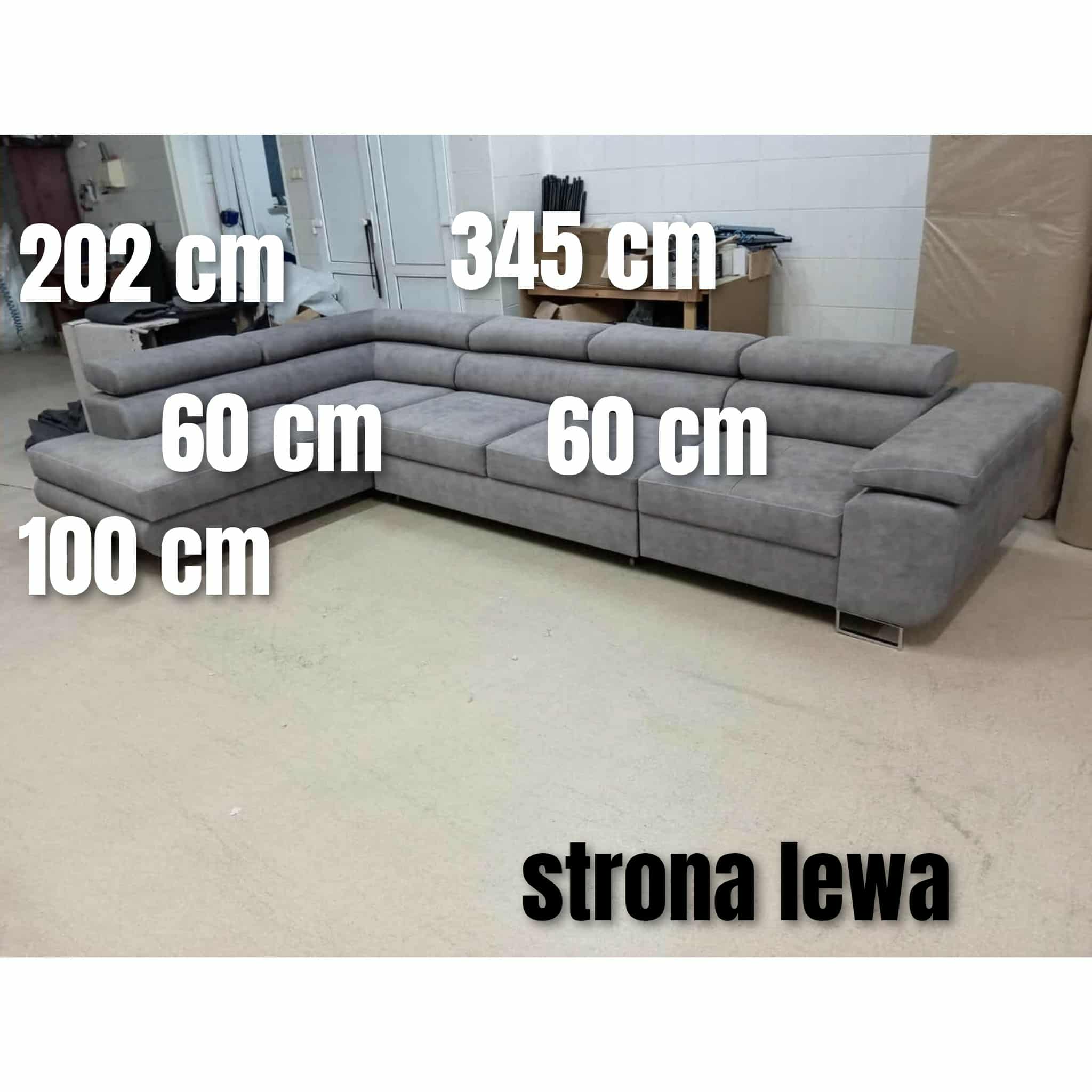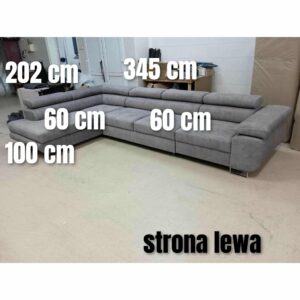 Narożnik wyposażony w funkcję spania w systemie rozkładania typu delfin oraz pojemnik na pościel umieszczony w otomanie narożnika.