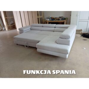 Narożnik wyposażony w funkcję spania w systemie rozkładania typu delfin oraz pojemnik na pościel umieszczony w otomanie narożnika.