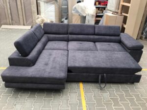 Narożnik wyposażony w funkcję spania w systemie rozkładania typu delfin oraz pojemnik na pościel umieszczony w otomanie narożnika.
