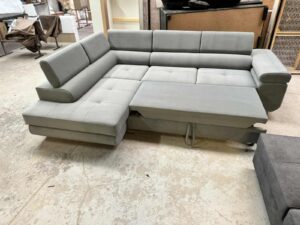 Narożnik wyposażony w funkcję spania w systemie rozkładania typu delfin oraz pojemnik na pościel umieszczony w otomanie narożnika.