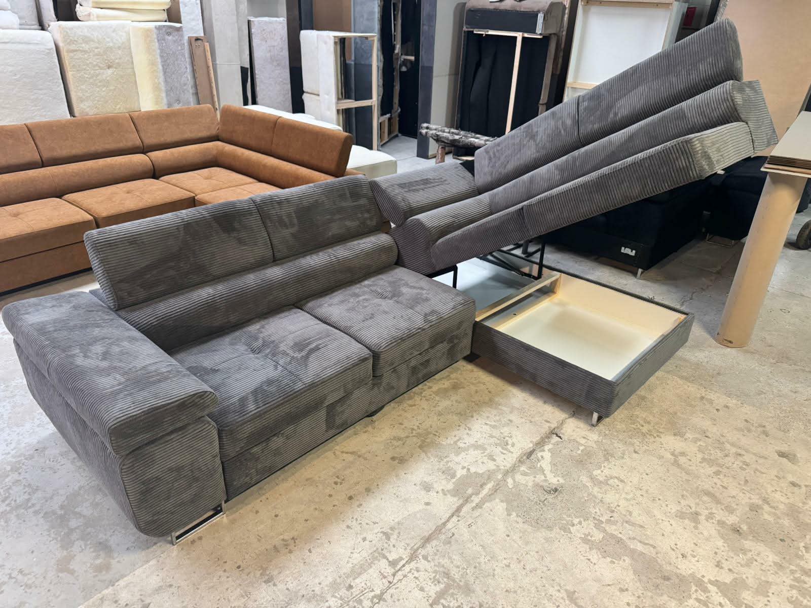 Narożnik wyposażony w funkcję spania w systemie rozkładania typu delfin oraz pojemnik na pościel umieszczony w otomanie narożnika.