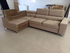 Narożnik wyposażony w funkcję spania w systemie rozkładania typu delfin oraz pojemnik na pościel umieszczony w otomanie narożnika.