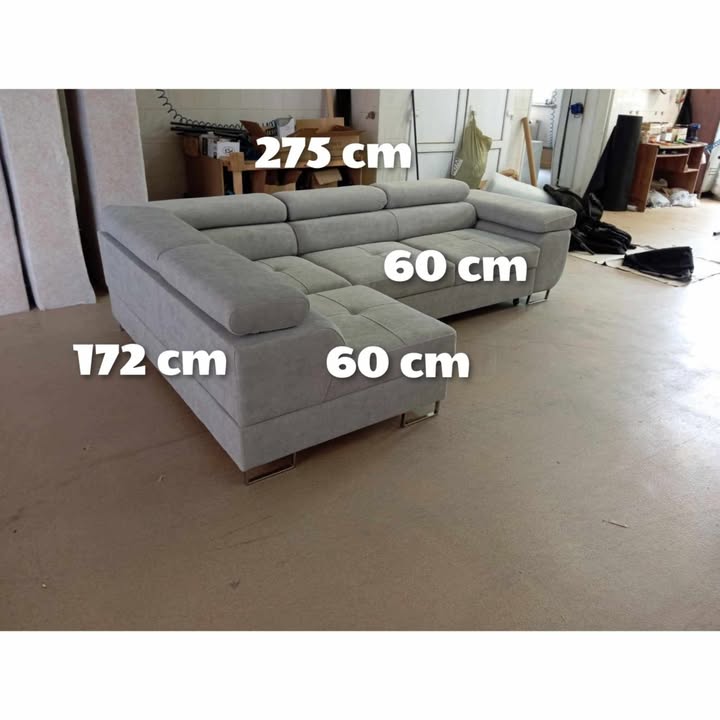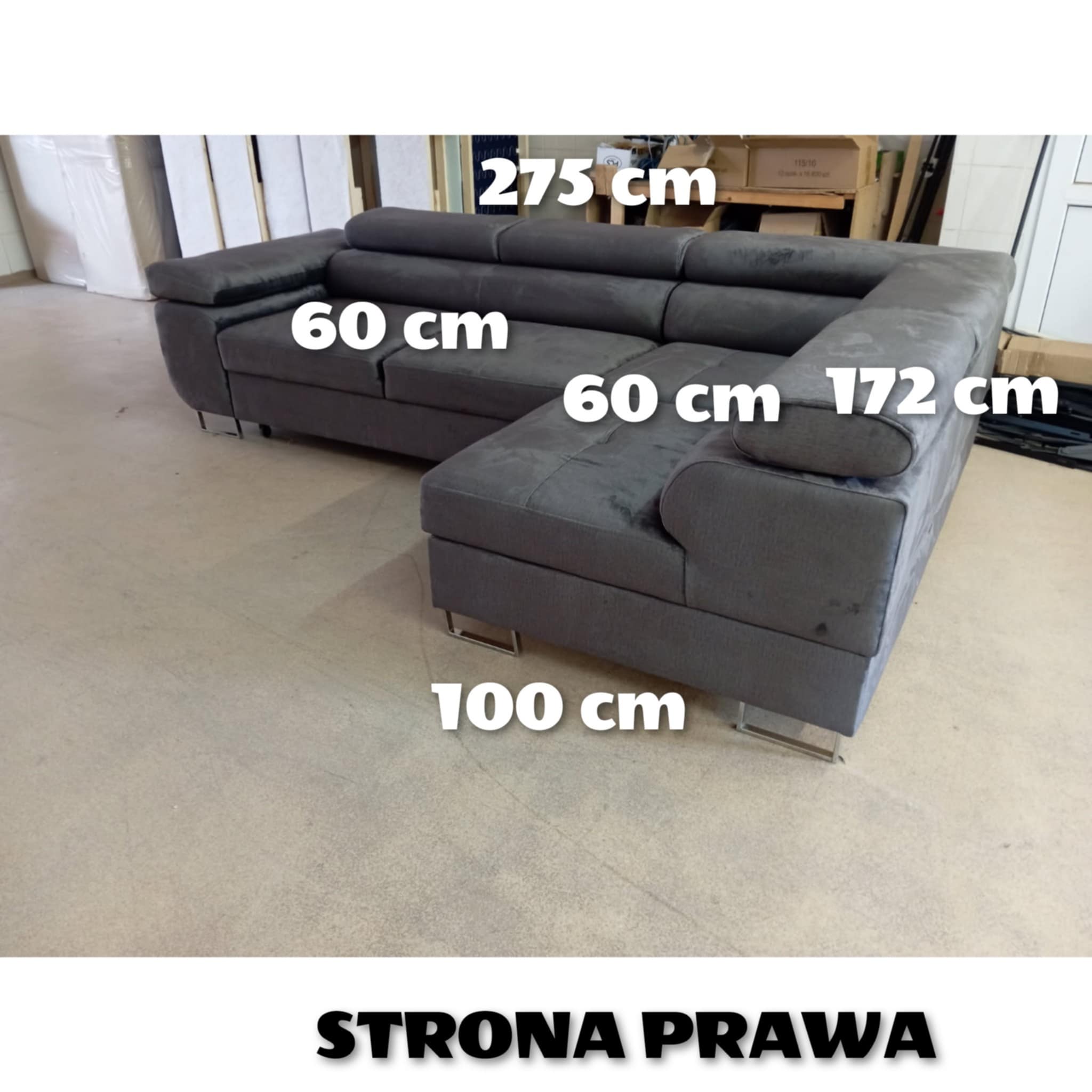 Narożnik wyposażony w funkcję spania w systemie rozkładania typu delfin oraz pojemnik na pościel umieszczony w otomanie narożnika.