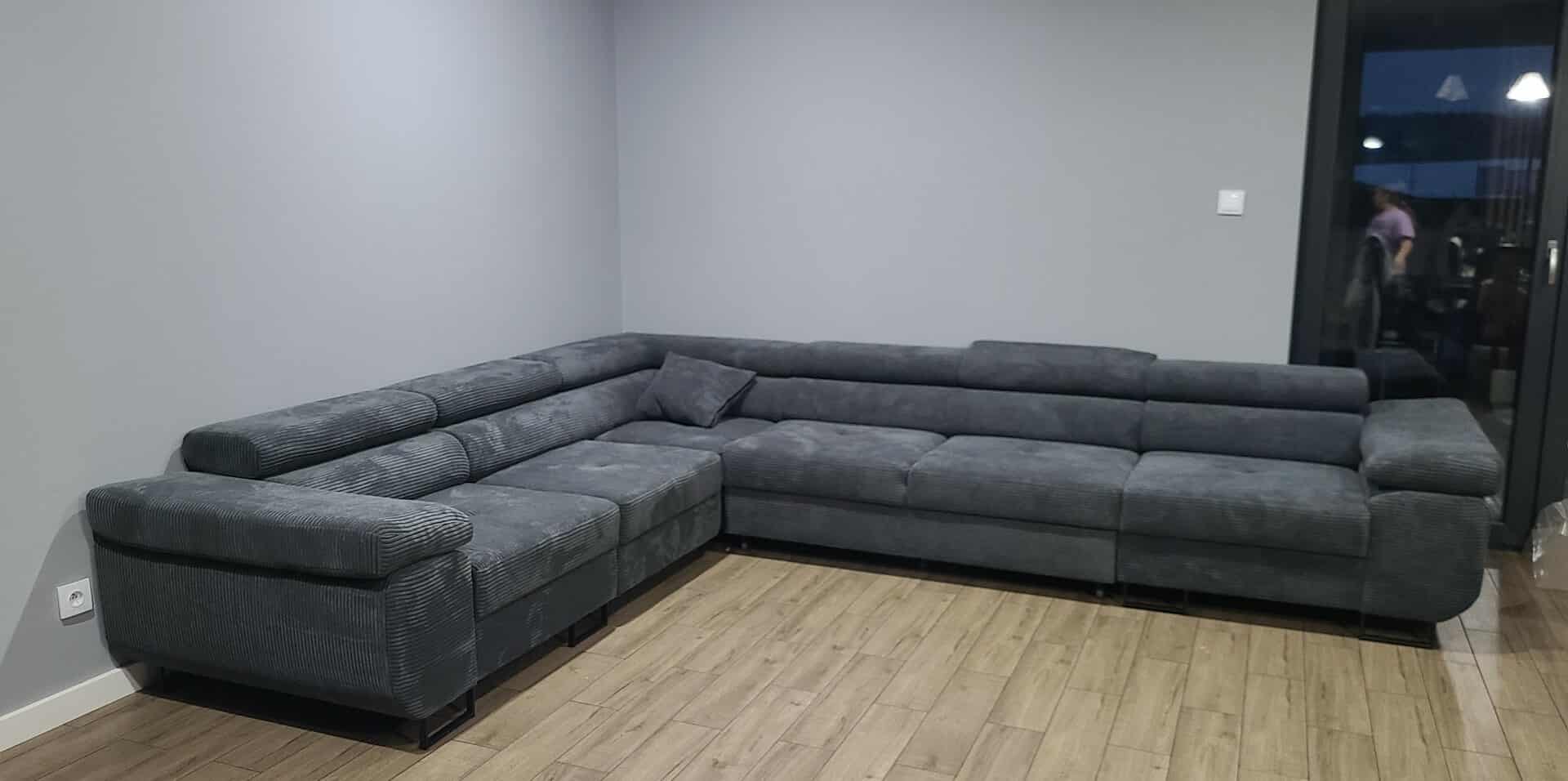 Narożnik wyposażony w funkcję spania w systemie rozkładania typu delfin oraz pojemnik na pościel umieszczony w otomanie narożnika.