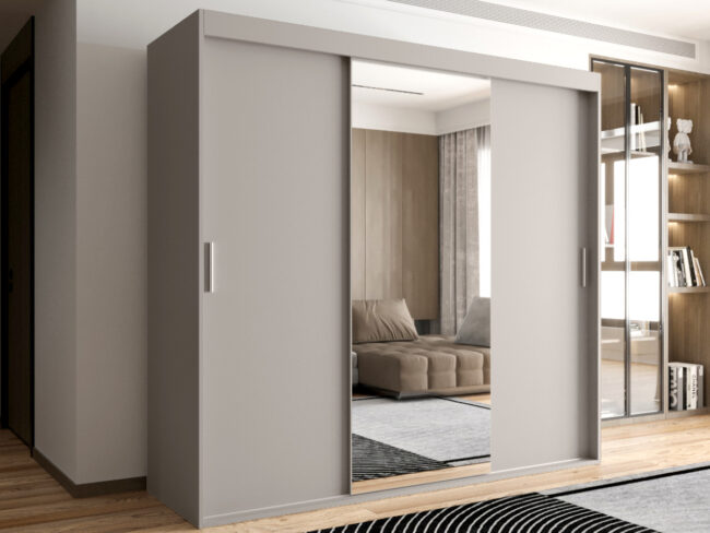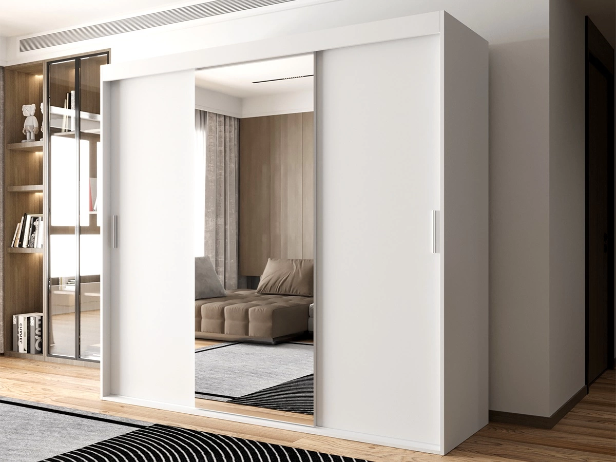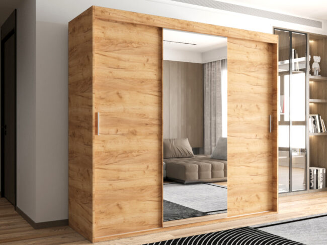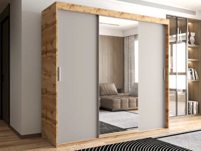 -Szafa trzydrzwiowa o szerokości 180 cm z lustrem została wykonana z płyty o grubości 16 mm.